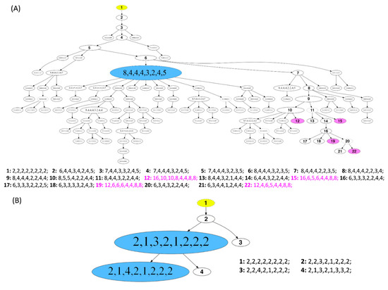 Phylogenetic trees of long survival cases (A) 5L and (B) 7L. The construction of the FISHtrees was done using phylogenetic algorithms (software FISHtrees 3.2) in the ploidyless mode. FISH patterns are depicted in the following gene order COX2, DBC2, MYC, CCND1, CDH1, TP53, HER2, ZNF217. The FISHtrees results show the clonal evolution by generating a tree model starting from a normal state root labeled in yellow color (2-2-2-2-2-2-2-2) continuing by heuristically seeking to minimize the total number of CNAs across the tree. The size of the nodes reflects, but is not proportional to, the frequency of the patterns in the cell population. Nodes encircled by a solid line reflects miFISH-signal-patterns observed in the tumor sample. The FISHtrees algorithm predicts transit signal-patterns that are not observed in the sample so that in the evolution tree generated by the algorithm the up and downstream nodes can be linked. Those transit patterns are represented by nodes encircled with a dashed line. Details of the analysis are described in Section 2. (A) The blue labeled node indicates the presence of the tetraploid major clone (pattern 8-4-4-4-3-2-4-5; consisting of 71 out of 250 analyzed nuclei). Detailed signal patterns for selected clones (1–22) are displayed in the legend. In 4 clones, whole genome duplication events occur, marked in pink color with the numbering 12, 15, 19 and 22 (patterns: 16-10-10-8-4-4-8-8; 16-6-5-6-4-4-8-8; 12-6-6-6-4-4-8-8; 12-4-6-5-4-4-8-8). (B) The blue labeled nodes indicate the presence of the major clone with the most common pattern (2-1-3-2-1-2-2-2; consisting of 217 out of 250 analyzed nuclei) and the clone with the second most common pattern (2-1-4-2-1-2-2-2; consisting of 29 out of 250 analyzed nuclei). Detailed signal patterns for selected clones (1–4) are displayed in the legend.