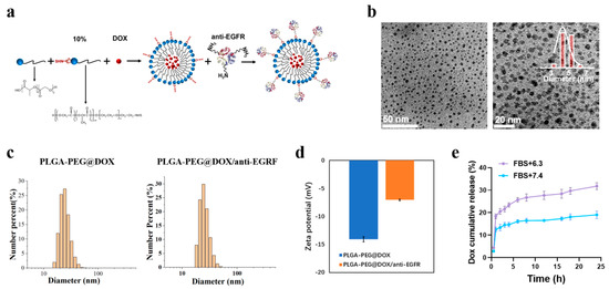 (a) PLGA-PEG@DOX/anti-EGFR nano-micelle synthesis strategy. (b) PLGA-PEG@DOX/anti-EGFR nano-micelles were assessed via TEM. (c) DLS was used to assess PLGA-PEG@DOX and PLGA-PEG@DOX/anti-EGFR nano-micelle size distributions. (d) PLGA-PEG@DOX and PLGA-PEG@DOX/anti-EGFR nano-micelle zeta potential values. (e) Cumulative DOX release from PLGA-PEG@DOX/anti-EGFR (pH = 7.4 or 6.3) in vitro over the course of 24 h in a 10% FBS solution at 37 °C. Samples were assessed in triplicate.