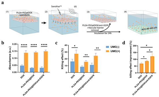 Ultrasonic cavitation-induced vascular permeability enhances DOX delivery to tumor cells. (a) Experimental overview: (1) free DOX, PLGA-PEG@DOX, or PLGA-PEG@DOX/anti-EGFR nano-micelles were added, after which (2) UMC treatment of the vascular barrier was performed, and (3) excess drug or nano-micelles were removed, after which the levels of these agents that had penetrated the vascular barrier was assessed, with (4) a CCK-8 assay being used to examine the impact of PBS, free DOX, PLGA-PEG@DOX, and PLGA-PEG@DOX/anti-EGFR nano-micelles on MDA-MB-468 cell viability. (b) UMC treatment promoted the penetration of free DOX, PLGA-PEG@DOX, and PLGA-PEG@DOX/anti-EGFR nano-micelles across the vascular barrier and (c,d) thereby significantly enhanced the cytotoxicity of these treatments towards MDA-MB-468 tumor cells owing to their ability to more efficiently cross the vascular layer (n = 3). * p < 0.05, ** p < 0.01, **** p < 0.0001. UMC(+) = with ultrasound-mediated cavitation, UMC(−) = without ultrasound-mediated cavitation.
