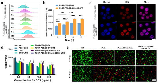 Flow cytometry (a) and corresponding mean fluorescence intensity values (b) for MDA-MB-468 cells following treatment with PLGA-PEG@DOX or PLGA-PEG@DOX/anti-EGFR nano-micelles (5 µg/mL DOX equivalent dose) for the indicated amounts of time (n = 3). *** p < 0.001, **** p < 0.0001. (c) MDA-MB-468 cells were assessed via confocal microscope following an 8 h treatment with PLGA-PEG@DOX/anti-EGFR nano-micelles (5 µg/mL DOX equivalent dose). Scale bar: 10 µm. (d) MDA-MB-468 cell viability was assessed following the indicated treatments with a range of DOX doses (2.5–20 µg/mL) for 24 h. Data are means ± standard deviation (n = 5). # PLGA-PEG@DOX+UMC vs. PLGA-PEG@DOX/anti-EGFR+UMC. # p < 0.05, ## p < 0.01. * PLGA-PEG@DOX/anti-EGFR vs. PLGA-PEG@DOX/anti-EGFR+UMC. ** p < 0.01, *** p < 0.001. (e) MDA-MB-468 cells fluorescence was assessed following the indicated treatment. Scale bar: 50 µm. UMC(+) = with ultrasound-mediated cavitation, UMC(−) = without ultrasound-mediated cavitation.