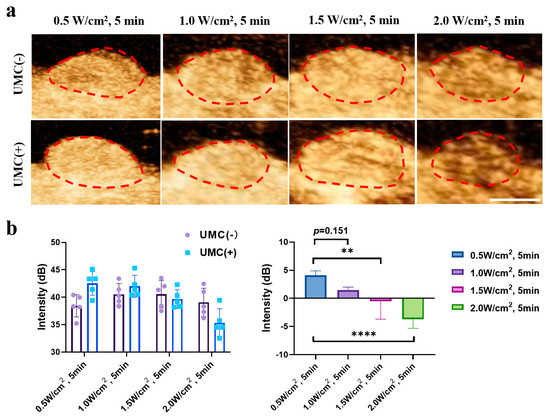 Assessment of UMC-induced changes in tumor perfusion. (a) The intra-tumoral perfusion of MDA-MB-468 tumor-bearing mice was assessed via CEUS pre- and post-treatment. (b) PI values from pre- and post-treatment CEUS analyses. Data are means ± standard deviation (n = 5). ** p < 0.01, **** p < 0.0001. Scale bar: 5 mm. UMC(+) = with ultrasound-mediated cavitation, UMC(−) = without ultrasound-mediated cavitation.