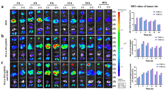 Biodistribution studies of free DOX, PLGA-PEG@DOX, and PLGA-PEG@DOX/anti-EGFR nano-micelles. MBA-MD-468 tumor-bearing mice were intravenously administered appropriate nano-micelles or free drug. Ex vivo fluorescence images of tumor (1) and major organs, including the heart (2), liver (3), spleen (4), lungs (5), and kidneys (6), in these mice were assessed at 2, 4, 8, 12, 24, and 48 h following free DOX (a), PLGA-PEG@DOX (b), or PLGA-PEG@DOX/anti-EGFR nano-micelle (c) administration. UMC(+) = with ultrasound-mediated cavitation, UMC(−) = without ultrasound-mediated cavitation.