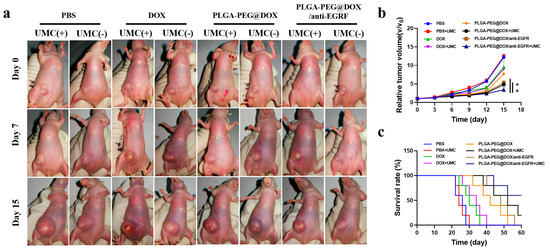 For mouse-model experiments, tumor-bearing animals were injected with 1 × 107 tumor cells in the right fat pad of the third pair of breasts. Once tumors were 40–60 mm3 in size, mice were randomly assigned to eight groups (n = 5/group): PBS, PBS + UMC, free DOX, DOX + UMC, PLGA-PEG@DOX, PLGA-PEG@DOX + UMC, PLGA-PEG@DOX/anti-EGFR, and PLGA-PEG@DOX/anti-EGFR + UMC groups. Appropriate treatments were administered intravenously in a 100 µL volume (PBS, free DOX, PLGA-PEG@DOX, or PLGA-PEG@DOX/anti-EGFR; 5 mg/kg DOX equivalent dose) with or without US irradiation (0.5 W/cm2, duty cycle: 50%, 5 min) as appropriate. The whole process was repeated on a weekly basis. Tumors were measured every three days with calipers, after which tumor volume was determined as follows: tumor volume (mm3) = length × width2/2. Body weight was measured every other day. On day 15 post-treatment, mice were euthanized, and tumors were resected for analysis.
