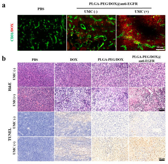 PLGA-PEG@DOX/anti-EGFR intra-tumoral drug delivery in vivo was assessed in combination with or without UMC treatment. Mice were intravenously administered PLGA-PEG@DOX/anti-EGFR (5 mg/kg DOX equivalent dose) or an equivalent volume of PBS, and tumor tissues were isolated at 24 h post-treatment. Confocal imaging of these tumors was then performed, with CD31 being used to stain the tumor-associated vasculature, revealing a gradient of DOX-associated fluorescence extending from the edge to the core of the tumor, with this fluorescence being more robust in the PLGA-PEG@DOX/anti-EGFR + UMC treatment group relative to the control and PLGA-PEG@DOX/anti-EGFR groups (Figure 7a). While PLGA-PEG@DOX/anti-EGFR was also able to diffuse into tumors to some extent, it did so to a lesser extent in the absence of UMC treatment as compared to the PLGA-PEG@DOX/anti-EGFR + UMC group. This may be attributable to temporary UMC-induced changes in the interstitial fluid pressure within tumors, thus supporting more robust drug diffusion therein [35]. Subsequent H&E and TUNEL staining of these tumor-tissue samples revealed extensive cellular damage within tumors in the PLGA-PEG@DOX/anti-EGFR + UMC treatment group (Figure 7b), consistent with extensive tumor-cell destruction. In TUNEL staining images, dark brown nuclei were indicative of apoptotic cell death (Figure 7b), consistent with the above staining results. Together, these results confirmed that PLGA-PEG@DOX/anti-EGFR + UMC treatment was detrimental to TNBC tumor growth primarily by promoting intra-tumoral DOX penetration.