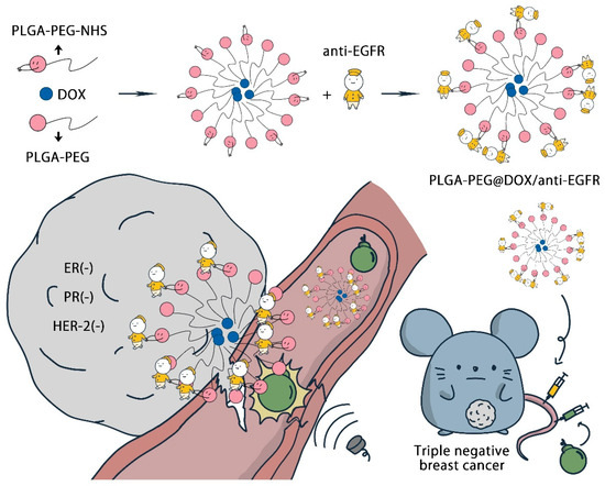 Triple-negative breast cancer (TNBC) refers to a form of breast malignancy that is negative for the expression of estrogen receptor (ER), progesterone receptor (PR), and human epidermal growth factor 2 (HER2), accounting for 10–15% of human breast cancers [1,2]. TNBC is generally considered to be associated with poorer prognosis and a higher risk of recurrence or metastasis owing to a lack of effective targeted therapeutic drugs [3,4,5]. At present, a combination of surgical resection and adjuvant chemotherapy/radiotherapy is the standard treatment for individuals with TNBC. More than half of TNBC patients exhibit the overexpression of epidermal growth factor receptor (EGFR) in tumor cells, and such overexpression is correlated with a poorer prognosis [6]. Some studies have suggested that EGFR may function as a driver of disease progression in most cases of TNBC [7,8]. As such, EGFR may represent a viable target that can be leveraged to guide the intra-tumoral delivery of chemotherapeutic agents or other drugs in TNBC patients. While researchers have sought to disrupt TNBC tumor growth using EGFR-blocking antibodies or other approaches for EGFR degradation, these treatments have failed to achieve beneficial outcomes in many TNBC patients [3,9,10], instead exhibiting a high degree of response heterogeneity. As such, there is a clear need for the development of novel therapeutic strategies capable of enhancing the chemo-therapeutic effect, reducing off-target toxicity, and delaying progression.