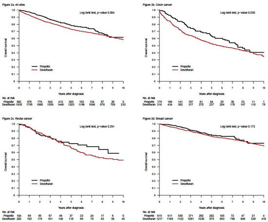 Kaplan–Meier curves for survival after propofol- or sevoflurane-based anaesthesia for three different cancer locations (all sites together = a; colon = b, rectum = c, and breast = d). The upper left graph was published in reference [33], Upsala Journal of Medical Sciences, Taylor & Francis (Creative Commons Attribution License).