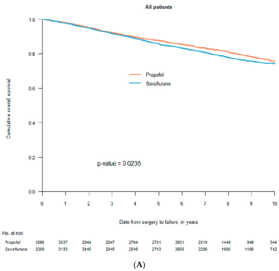 - Lai, H.C.; Lee, M.S.; Lin, K.T.; Huang, Y.H.; Chen, J.Y.; Lin, Y.T.; Hung, K.C.; Wu, Z.F. Propofol-based total intravenous anesthesia is associated with better survival than desflurane anesthesia in robot-assisted radical prostatectomy. PLoS ONE 2020, 15, e0230290. [Google Scholar] [CrossRef] [PubMed]
