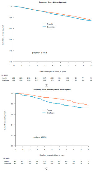 Kaplan–Meier curves for survival after propofol- or sevoflurane-based anaesthesia. Graph (A) includes all 6305 patients before statistical adjustments; graph (B) includes 2298 pairs after propensity score match without the seven participating clinics included as a co-factor in the statistical analysis; graph (C) includes 418 pairs after propensity score match with the seven participating clinics included in the statistical analysis (with permission from Acta Anaesthesiologica Scandinavica, Wiley; reference [61]).