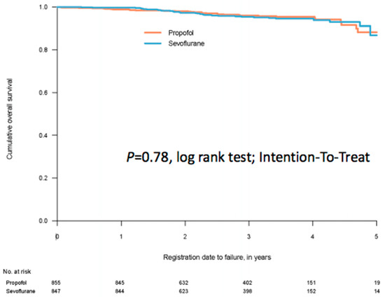 - Wigmore, T.J.; Mohammed, K.; Jhanji, S. Long-term Survival for Patients Undergoing Volatile versus IV Anesthesia for Cancer Surgery: A Retrospective Analysis. Anesthesiology 2015, 124, 69–79. [Google Scholar] [CrossRef] [PubMed]
