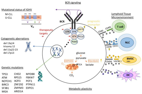 CLL is the most frequent lymphoproliferative disease in the western world [1,2] characterized by the clonal proliferation and progressive accumulation of mature, typically CD5-positive B-cells in the blood, bone marrow, and secondary lymphoid tissues [2,3,4]. It shows a high biological, genetical, molecular and clinical diversity [1,5], projecting its highly heterogenous pathophysiology (Figure 1, Table S1). Among the known features with clinical relevance in the pathobiology of CLL are the highly genetic mutations acting either independently or in combination with chromosomal rearrangements [1,5]. Driver mutations have been associated with adverse clinical outcomes, and thus serve as biomarkers, indicators of therapeutic options or as potential therapeutic targets (Table S1) [2,4,5,6,7,8]. Somatic mutations in immunoglobulin heavy chain variable region gene (IGHV), activating B cell receptor (BCR)-signaling kinases lead to the lower survival and proliferation of CLL cells, providing patients with “mutated” M-CLL, which is a better clinical outcome vs. “unmutated” U-CLL patients [2,9]. It is important to mention that the signaling of UM-CLL is generally highly responsive to the antigenic stimulus, while M-CLL are anergic. Continual or repetitive BCR signaling adds further complexity in CLL pathogenesis, contributing to autophagy regulation, promoting tumor survival, proliferation, and consequently tumor progression [10]. Complex karyotype (CK), defined by the presence of at least three genetic abnormalities in the same clone, is detectable in 14–34% of CLL cases and it is recommended as a new negative prognostic biomarker associated with an adverse outcome and worse response to chemoimmunotherapy [11,12,13,14,15]. Other intriguing features of vital significance in the growth, survival, and drug resistance of CLL cells are metabolic plasticity and signals from the lymphoid tissue microenvironment (LTME) [2,4]. Metabolic plasticity involves the main metabolic pathways of mitochondrial biogenesis and bioenergetics, ROS production, and adaptation to intrinsic oxidative stress, found to be elevated in CLL [16]. LTME produces various essential proteins and metabolites [3,17] modulating the redox and metabolic state of CLL cells [18] and switching either to oxidative phosphorylation (OXPHOS) or glycolysis [19]. Furthermore, enhanced BCR signaling induces the metabolic activation of CLL cells through OXPHOS, energetically supporting the transcription and translation processes [20].