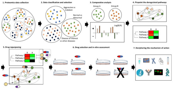 The repurposed drugs can be further in vitro validated [144]. The first step is to show that the drugs indeed have the expected properties on the patients’ tumor cells that belong to the subgroups that have been investigated, or, if possible, on commercially available cell lines that have the same identities with the patients’ subgroups. The repurposed drugs can be further validated to determine both their targeted mechanism of action and their general molecular consequences in the cells. Subsequently, the minimum effective dose of the drug can be also determined experientially and correlate with the doses already given in clinical practice. Furthermore, drug combinations and synergies that were found to be effective in silico can be also confirmed in vitro in the same way. Drugs and drug combinations found to be effective by the above-mentioned process can be administered to individuals in anticipation of a better effectiveness and reduced toxicity [135,145]. This process can also be repeated during the progression of the disease, based on the new patients’ data. However, more user-friendly, quick, efficient, and affordable proteomic analysis methods, as well as drug repurposing pipelines, are required to apply this method in clinical practice.