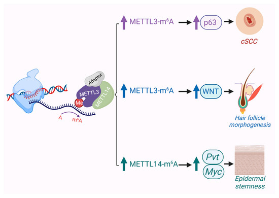 - Xi, L.; Carroll, T.; Matos, I.; Luo, J.-D.; Polak, L.; Pasolli, H.A.; Jaffrey, S.R.; Fuchs, E. m6A RNA methylation impacts fate choices during skin morphogenesis. eLife 2020, 9. [Google Scholar] [CrossRef]