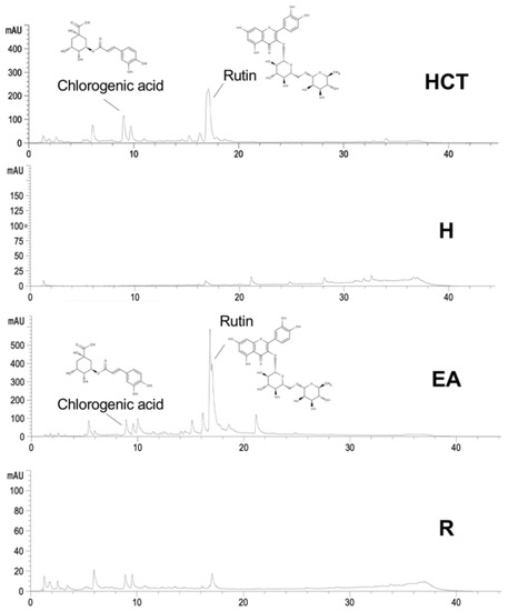 3.1. Comparison of Phytochemical Compositions in HCT and EA by HPLC