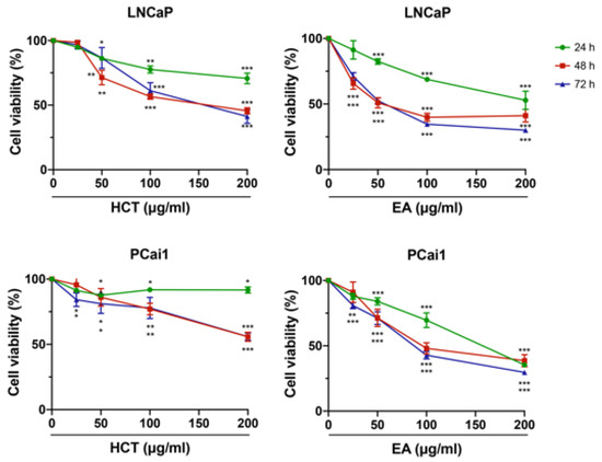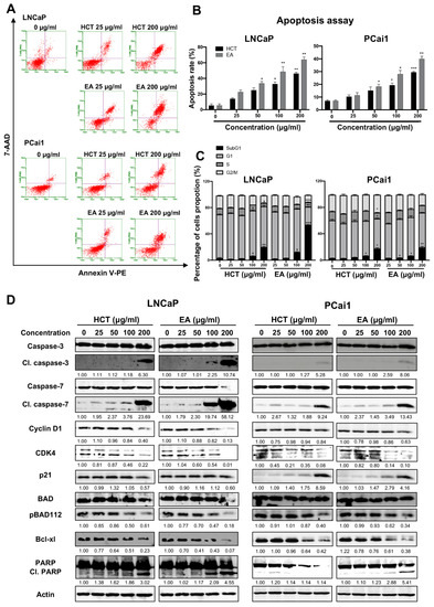3.2. HCT and EA Inhibit Cell Proliferation and Induce Apoptosis in Prostate Cancer Cell Lines