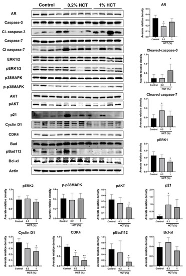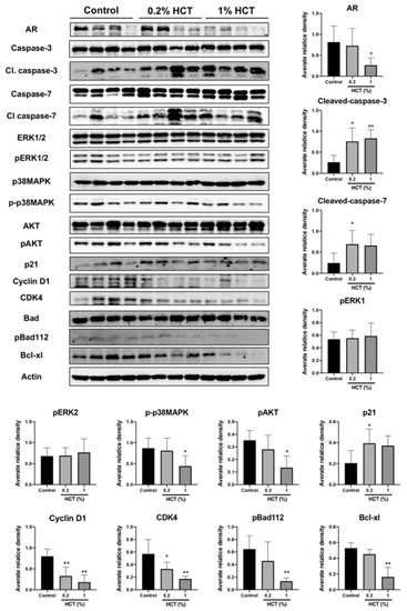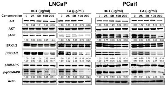 3.3. HCT and EA Induce Apoptosis via Suppressing AR Expression and Inactivating the Phosphorylation of AKT/ERK/p38 MAPK Pathways in Prostate Cancer Cells