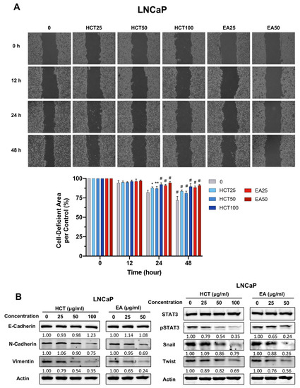 3.5. HCT and EA Suppress EMT and Prostate Cancer Cell Migration through STAT3/Snail/Twist Pathways