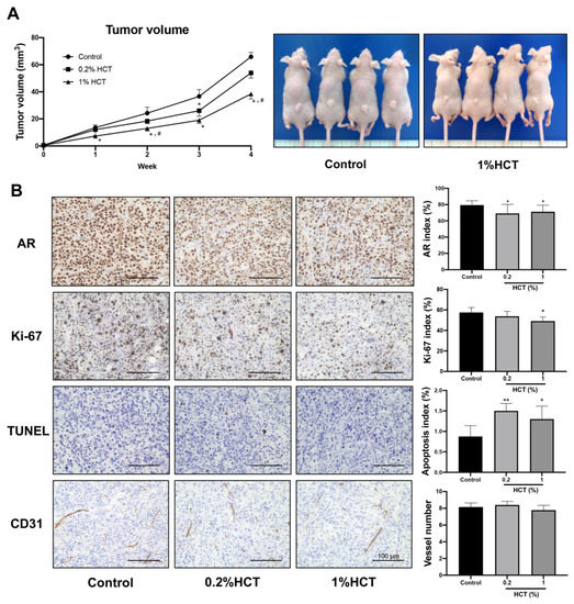 3.8. HCT Inhibit Tumor Growth and Their Signaling in the PCai1 Xenograft Mice Model
