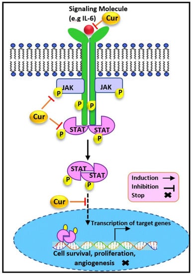 Besides, the persistent autocrine expression of IL-6 cytokine has been considered as an important contributor to progression, resistance, and immune suppression in TNBC. IL-6 also plays a critical role in transforming the dormant breast cancer cells into the actively growing tumor [,]. On the other hand, IL-6 activation has been reported to trigger the STAT3 phosphorylation and its activity [,,]. It has been previously shown that the production of IL-6 was significantly reduced in TNBC in vivo 4T1 following curcumin treatment []. Hence, another mechanism of curcumin’s modulatory effect on the STAT3 pathway has been suggested to be its impact on IL-6, which is able to turn on the initiation of the IL-6/JAK/STAT3 pathway.
