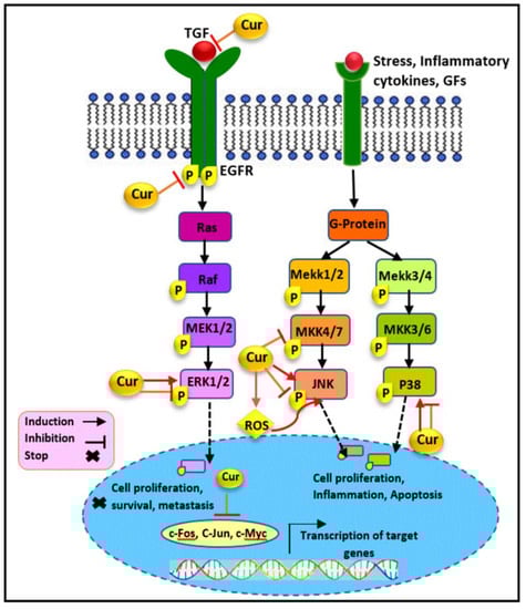 As shown in Figure 3, MAPK signaling pathways not only promote cellular proliferation and survival, but can also mediate cell death depending upon the cell types and stimuli [,]. In this regard, several lines of evidence illustrated that curcumin, under certain circumstances, induces cancer cell death through MAPK activation. The published literature has demonstrated that the upregulation of the enhancer of zeste homolog 2 (EZH2), involved in cell cycle regulation, is correlated with tumor invasiveness and aggressive clinical behavior as well as the poor prognosis of breast cancers []. It was found that curcumin diminished EZH2 expression via the phosphorylation and activation of ERK, JNK, and p38 in MDA-MB-435 cells []. Similarly, curcumin-mediated apoptosis and autophagy have been detected through the increased activity of ERK, JNK, and Beclin1 in treated MDA-MB-231 []. The subsequent study on MDA-MB-231 and Hs578T has demonstrated that curcumin suppresses their proliferation, migratory potential, and induced cell cycle arrest and apoptotic cell death. The immunohistochemistry of clinical tissue specimens demonstrated the curcumin-induced attenuation of ki-67 and proliferation-associated nuclear antigen (PCNA), in the respective tumor tissues. The findings also represented an increase in phosphorylated JNK expression and, subsequently JNK pathway activation, which was associated with enhanced ROS generation. In agreement with analysis, curcumin was also found to prevent tumor growth and metastasis in a MDA-MB-231 xenograft mouse model. Therefore, the anticancer activity of curcumin is meditated via the ROS/JNK signaling pathway []. Although reports revealed that the growth inhibition of SKBR-3 cells induced by curcumin treatment was not associated with the suppression of MAPK P38 and ERK expression or phosphorylation [,], another study demonstrated that curcumin treatment on SKBR-3 cells resulted in the inhibition of ERK phosphorylation and was also able to sensitize hormone-independent HER2+ cells to TNF-related apoptosis inducing ligand (TRAIL) []. Furthermore, the increased phosphorylation of JNK found in curcumin-treated SKBR-3 cells led to the induction of JNK-dependent apoptosis [].