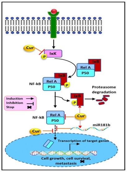 The modulatory effect of curcumin on the NF-κB pathway. Curcumin inhibits the NF-κB signaling pathway through the regulation of its key components. Curcumin upregulates IκB and miR181b expression and downregulates NF-κB and IKK, and suppresses the NF-κB translocation into the nucleus, which results in the inhibition of cellular proliferation, survival, metastasis, and angiogenesis in hormone receptor negative breast cancer. Cur: curcumin, IκK: inhibitor of kappa B kinase, IκB: inhibitor of NF-κB, Rel A: p65.