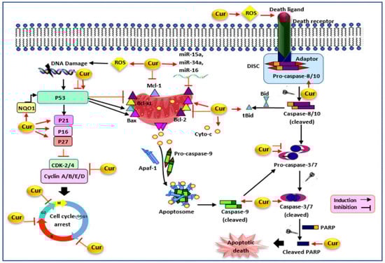 The modulatory effect of curcumin on p53, cell cycle, and apoptosis pathways. Curcumin inhibits cell cycle progression and induces apoptosis by targeting various molecules. Curcumin triggers ROS generation and alters the expression level of caspases (caspase-3/7, 8, 9), PARP, Bcl-2 family proteins (Mcl-1, Bcl-xL, Bid, Bax, Bcl-2), cytochrome-c, and miRNAs (miR-34a, miR-15a, miR-16), which results in apoptotic cell death in hormone receptor negative breast cancer. Curcumin also modulates P53 expression, upregulates CDKI (P21, P27, P16), and downregulates cyclins (cyclin A, B, E, D) and CDKs (CDK-2, -4), which results in cell cycle arrest in hormone receptor negative breast cancer. Cur: curcumin, DISC: death-inducing signaling complex, Bcl-2: B-cell lymphoma 2, Bid: BH3 interacting-domain death agonist, tBid: truncated Bid, Bax: Bcl-2 associated X protein, Bcl-xL: B-cell lymphoma-extra large, Mcl-1: myeloid cell leukemia 1, APAF-1: apoptotic protease activating factor-1, Cyto-c: cytochrome c, PARP: poly (ADP-ribose) polymerase, ROS: reactive oxygen species, CDK: cyclin-dependent kinase, NQO1: NAD(P)H dehydrogenase (quinone 1).