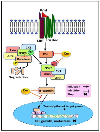 Signaling by the secreted glycolipoprotein factors of the Wnt family via β-catenin, as the transcription co-activator, regulates multiple developmental processes during embryogenesis and adult homeostasis through its critical role in cell growth, differentiation, and cellular metabolism [,]. Once the Wnt signaling molecule presents itself, it binds to a Frizzled receptor and triggers the activation of the co-receptor LRP, leading to a transfer of the biological signal to a Disheveled (Dvl) protein within the cytoplasm. The activated Dvl protein then prevents the hydrolysis of β-catenin by a destructive multiprotein complex composed of several proteins, such as GSK3, APC, Axin, and CK1. As a result, β-catenin remains stable inside the cytosol. Accordingly, β-catenin, as the core component of this pathway, accumulates, migrates to the nucleus, and displaces the transcriptional repressor Groucho protein through the formation of the β-catenin/TCF/LEF transcriptional complex. Eventually, the transcription of Wnt-responsive genes such as slug, cyclin D1, VEGF, c-myc, and MMPs will be initiated. However, in the absence of extracellular Wnts, the β-catenin destruction complex promotes the phosphorylation, ubiquitinylation, and degradation of β-catenin in proteasome. Therefore, this pathway is maintained in an off state [,].