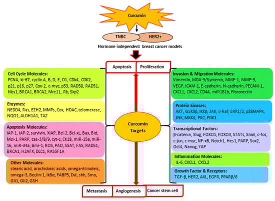 Multi-target action of curcumin against TNBC and hormone-independent HER2 positive breast cancer. Curcumin induces apoptotic cell death and suppresses cellular growth, proliferation, metastasis, angiogenesis, and cancer stem cell through the regulation of multiple molecular targets.
