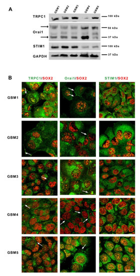 Glioblastoma stem cells express store-operated channels Orai1 and TRPC1 and their activator STIM1. (A): Immunoblotting of TRPC1, Orai1 and STIM1 proteins from five different primary cultures of GSC (GBM1-GBM5) derived from patients with GBM. Arrows point to the two bands obtained for Orai1 that correspond to the unglycosylated (37 kDa) or the glycosylated (50 kDa) form of Orai1. (B): Micrographs depicting co-labeling of TRPC1, Orai1 or STIM1 (green) with SOX2, a stem cell marker (red), in the five GBM cultures. Arrows indicate the membrane localization of the labeling. Scale bar: 25 µm. Abbreviations: STIM1, stromal interaction molecule 1; TRPC1, transient receptor potential canonical 1; kDa, kiloDalton.