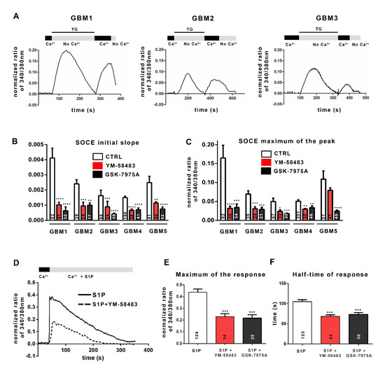 Physiologically, various extracellular signals, after binding to their receptor, activate intracellular signaling pathways which in turn, stimulate SOC and ROC. Among these signals, sphingosine-1-phosphate (S1P), a molecule present in the GBM microenvironment, has been reported to induce the production of IP3 and DAG, which in turn, could trigger the activation of SOC and ROC, respectively [27,28,29,30]. Figure 2D shows that S1P leads to an increase in the intracellular Ca2+ concentration in GBM cells. This pattern includes two phases: a maximum of calcium entry followed by a “plateau”, resulting from Ca2+ influx via SOC and ROC. The addition of the SOCE inhibitor YM-58483 (dashed line in Figure 2D) leads to a decrease in both phases. Both the maximum response (maximum of the normalized ratio of 340/380 nm) and the half-time response (plateau phase) are affected by SOCE inhibitors (YM-58483 and GSK-7975A; Figure 2E,F), showing on the one hand the involvement of SOCE in S1P-triggered Ca2+ intracellular signal and on the other hand, the recruitment of SOC by physiological stimuli of the tumoral microenvironment in GSC.