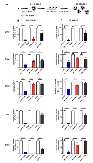 3.3. SOCE Inhibition Reduces the Stem Cell Population in GSC Cultures