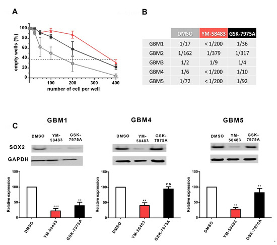 To further confirm the effects of SOC inhibitors on the stem cell population, the expression of SOX2 was assessed. SOX2, which is a transcription factor necessary for the maintenance of glioblastoma stem cell tumorigenic activity, is commonly used to detect the stem cell population in glioblastoma [32,33,34]. Figure 5C illustrates that SOX2 expression was significantly decreased upon treatment with YM-58483 in all GBM cells tested and with GSK-7975A in 2 of 3 GBM cells tested, confirming a role of SOC in the maintenance or expansion of GSC.