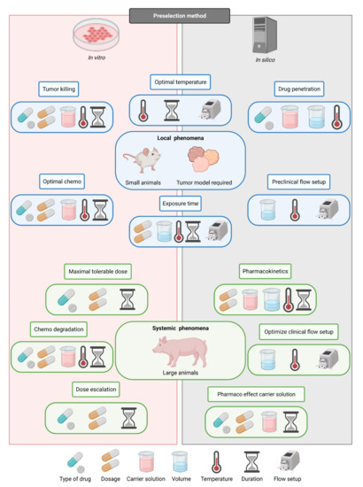 | 5. Temperature | 2 | [51,52] | Effect on drug uptake and/or tumor sensitivity | Mouse, rat | Syngeneic, xenograft or PDX |