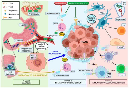 Proposed model of microbial dysbiosis driven pancreatic carcinogenesis. Phase 1: The tumor induction in the case of flora dysbiosis is related to the production of different substances that can be responsible for point mutations of genes like KRAS and TP53 of pancreatic ductal cells (e.g., polyamines produced by H. pylori and L. reuteri, or the enzyme peptidyl-arginine-deaminase of P. gingivalis). Phase 2: Tumor progression after the proliferation of the first cell-clone is sustained by bacterial-induced inflammation. Dysbiosis of the gut flora and alterations of the intestinal wall permeability originate from diet-disbalance and finally facilitate the migration of microorganisms into the pancreas. In particular, the translocation of Gram-negative bacteria elicits an inflammatory response. This one occurs when PMNs recognize bacterial LPS via TLR4 with consequent production of ROS. In this way, the establishment of an oxidative stress disbalance sustains the carcinogenic process. Phase 3: Intrapancreatic mechanisms of receptor-related molecular feedback lead for a second time to a switch of the immune response towards a tolerogenic phenotype. In particular, the activation of TLR4 expressed by DCs and M2-polarized TAM induces Th2-deviated CD4+ cells. However, it is still unclear if this receptor function of TLR4 depends on binding of either bacterial LPS or other uncharacterized tumoral products (marked with “?” in the picture) [,]. Furthermore, the activation of TLR9, an essential receptor for the recognition of CpG bacterial-DNA expressed on PSCs, stimulates the production of fibrous stroma and the expression of CCL11, a mediator with pro-tumorigenic effects on pancreatic ductal cells. TLR9 activation also leads to the PSC-dependent recruitment of Treg and MDSCs in the TME []. Abbreviations: DC: dendritic cell; MDSC: myeloid-derived suppressor cell; PMN: polymorphonuclear cells; PSCs: pancreatic stellate cells; ROS: radical oxygen species; TAM (M2): tumor-associated macrophages with M2 polarization; Th2: T-helper type 2 cells; Treg: T-regulatory cells. (Picture created in BioRender.com, https://biorender.com, accessed on 23 April 2021).