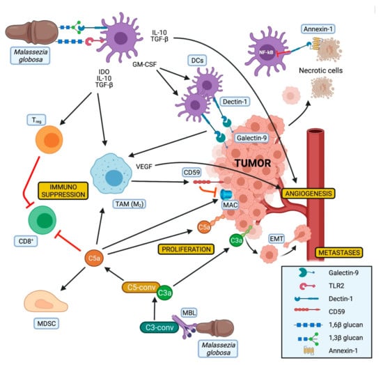 Proposed model of the role of Malassezia spp. in pancreatic tumor progression. The relation between Malassezia and pancreatic tumor progression is linked to the action of both cellular and molecular effectors, which lead to an intratumoral immune shaping. (1) Dendritic-cells (DCs): the synchronous recognition of fungal antigens like 1,3- and 1,6-β glucan by DCs lead to the production of GM-CSF [], with consequent cell-expansion and release of indoleamine 2,3-dioxygenase (IDO), IL-10, and TGF-β. These mediators favor the activation of Treg, which inhibit T-cells cytotoxicity (CD8+) and stimulate a switch of tumor-associated macrophages (TAM) towards an M2-phenotype []. On the other hand, IL-10 and TGF-β, together with VEGF produced by the TAMs, stimulate the intratumoral angiogenesis. Thanks to the expansion of DCs, more Dectin-1 can bind Galectin-9, a lectin expressed on tumor cell membrane, and contribute to the M2-shift of the TAM []. Moreover, Dectin-1 can bind Annexin-1 on dying tumoral cells, leading to NF-kB inactivation [,]. (2) Complement system: the recognition of Malassezia through MBL activates the complement cascade, leading to formation of active C3 and C5 convertases. Among the different complement components, C3a and C5a both lead to tumor cell proliferation by binding their specific receptors expressed on PDAC cells. Furthermore, the signaling of C3aR increases the epithelial–mesenchymal transition (EMT), promoting the metastatic process. C5a acts in an immunosuppressive way by inducing apoptosis of CD8+ cytotoxic cells, attracting MDSC into the tumor, and participating in the shift of the macrophages towards an M2-phenotype []. Of note, the fact that TAMs can induce the expression of CD59 on PDAC cells limits the antitumoral activity of the MAC. Abbreviations: C3-conv: C3-convertase; C5-conv: C5-convertase; CD8+: cytotoxic CD8+ T-cells; DC: dendritic cell; EMT: epithelial-mesenchymal transition; IDO: indoleamine 2,3-dioxygenase; MAC: membrane attack complex of the complement system; MBL: mannose binding lectin; MDSC: myeloid-derived suppressor cell; TAM: tumor associated macrophages M2 polarized; Treg: T-helper regulatory cell; VEGF: vascular endothelial growth factor. (Picture created in BioRender.com, https://biorender.com, accessed on 23 April 2021).