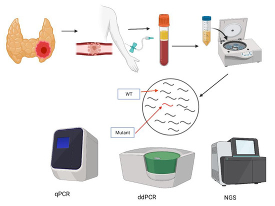 Techniques for the genomic profiling of cancers by liquid biopsy can be divided into two main strategies. The first is a targeted approach, whereby tumor-specific biomarker(s), identified from a prior tumor biopsy, are assayed to monitor residual disease. PCR-based assays are ideal for rapidly interrogating one or a small number of mutation hotspots. Traditional real-time PCR with hydrolysis probes is the most rapid and cheap method of ctDNA detection, although its sensitivity in detecting mutations in background wild-type (WT) DNA is limited to a mutant allele frequency (MAF) of 10–20%. Fortunately, several different improvements to the original chemistry have led to drastic improvements in assay sensitivity. One of the most widely used of these newer techniques is competitive, allele-specific TaqMan PCR (castPCR) technology. Developed by Barbano et al., it achieves a sensitivity of 0.1% MAF by utilising a mutation-specific primer and a minor groove-binding blocker to suppress WT amplification [39]. Droplet-digital PCR (ddPCR) was developed to provide high precision and the absolute quantification of targets, and could potentially detect mutations at levels as low as 0.01%. MAF. The ddPCR assay is based on water–oil emulsion droplet technology that fractionates a DNA sample into thousands of droplets, which are then PCR-amplified using allele-specific hydrolysis probes. After the PCR, each droplet either contains mutant, WT or no DNA, thus allowing for an absolute estimation of the number of mutant copies and their concentration in the reaction under the assumption of Poisson distribution. Next-generation sequencing technologies (NGS)-based amplicon panels can simultaneously genotype many hotspots; however, as it is a time-consuming and expensive approach, it may not be routinely needed for the small number of mutations that can currently inform thyroid cancer management. [40,41,42]. The major disadvantages of targeting screening are that it requires prior knowledge of the tumor’s genetic makeup and is blind to the acquired mutations that may arise over the course of treatment. However, targeted monitoring can be extremely sensitive, as mutations can be detected at allele frequencies down to 0.01%, with high specificity, in a fast and cost-effective rate manner.