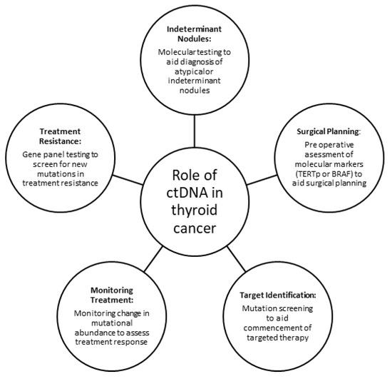 The management of thyroid cancer has previously been limited to local therapies, including surgery and radiation therapy. Recently, the development of molecular-based therapies has provided the potential for disease control in patients with advanced and radioactive iodine refractory disease [18,77]. Lenvatinib and sorafenib are multitargeted TKI, and have been shown to improve progression-free survival [17,18]. More specific kinase inhibitors target driver mutations, e.g., selpercatinib, in RET-mutated thyroid cancers [18,19,20]. TKIs are associated with significant drug toxicities, including diarrhoea, palmar-plantar-erythroysesthesia and hypertension; therefore, it is vital to determine the optimal time at which to commence therapy, while also closely monitoring the response, to maximise efficacy [78]. ctDNA provides the potential to monitor mutational load while screening for new mutations, which may lead to treatment resistance.