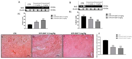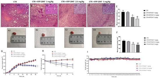 Furthermore, we investigated the role of Ki-67, a nuclear protein associated with tumor proliferation and progression [28,29]. As shown in the Figure 4C, the blot revealed a marked expression of Ki-67 in the control group whereas the treatment with KYP-2047 at doses of 2.5 mg/kg and 5 mg/kg significantly reduced its expression (see densitometric analysis 4C1). Moreover, Ki-67 was evaluated also by immunohistochemistry assay confirming the results obtained as showed in the Figure 4D–F (see immunohistochemistry score 4G).