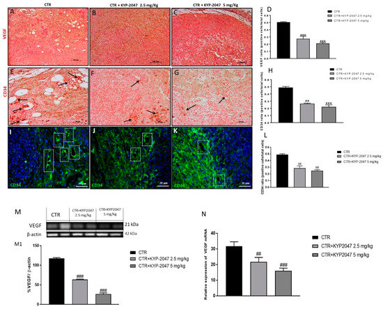 Effect of KYP-2047 on vascular endothelial-growth-factor (VEGF) and CD34 expression. Immunohistochemical staining showed a marked expression of VEGF and CD34 in the control group (A,E) whereas the treatment with KYP-2047 at doses of 2.5 mg/kg and 5 mg/kg significantly reduced their expression (B,C,F,G). Sections were observed and photographed at 10×, 20× and 40× magnification The data for VEGF were confirmed also by western blot analysis and quantitative real-time polymerase chain reaction (RT-qPCR), showing a decrease of VEGF expression following KYP-2047 treatment (M,N). Moreover, the data for CD34 were confirmed also by immunofluorescence assay (I,J,K). Data are representative of at least three independent experiments. (D) ### p < 0.001 vs. CTR; (H) ## p < 0.01 vs. CTR; ### p < 0.001 vs. CTR. (L) ## p < 0.01 vs. CTR; (M) ### p < 0.001 vs. CTR. (N) ## p < 0.01 vs. CTR; ### p < 0.001 vs. CTR.