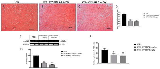 Effect of KYP-2047 on endothelial-nitric-oxide synthase (eNOS) expression. Immunohistochemical staining showed a marked expression of eNOS in the control group (A) whereas the treatment with KYP-2047 at doses of 2.5 mg/kg and 5 mg/kg significantly reduced its expression (B,C). Sections were observed and photographed at 10× magnification. The data were confirmed by Western blot analysis and RT-qPCR, showing a decrease of eNOS expression following KYP-2047 treatment (E,F). Data are representative of at least three independent experiments. (D) ### p < 0.001 vs. CTR; (E) ### p < 0.001 vs. CTR. (F) # p < 0.05 vs CTR; ## p < 0.01 vs. CTR.