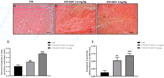 Effect of KYP-2047 on caspase-3 expression. Immunohistochemistry assay revealed an increase of cleaved-caspase-3 expression following KYP-2047 treatment at doses of 2.5 mg/kg and 5 mg/kg compared to control group (A–C). Sections were observed and photographed at 10× magnification. Additionally, the data for caspase-3 were confirmed also by a colorimetric assay kit as shown in the panel E. Data are representative of at least three independent experiments. (D) ## p < 0.01 vs. CTR; ### p < 0.001 vs. CTR; (E) ## p <0.01 vs. CTR; ### p < 0.001 vs. CTR.