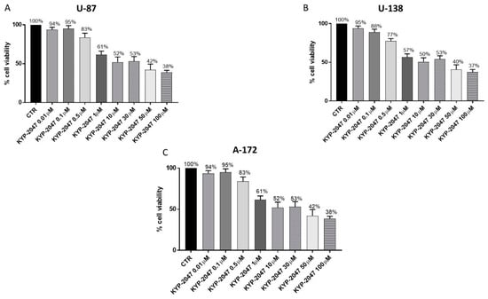 To confirm the promising results obtained by an in vivo U87-xenograft model, we decided to conduct an in vitro model of GB on U-87, A-172 and U-138 cell lines. Firstly, we evaluated the cytotoxicity of KYP-2047 at different concentrations on U-87, A-172 and U-138 GB cells, demonstrating that KYP-2047 was able to significantly reduce cell viability in all three GB cell lines in a concentration-dependent manner.