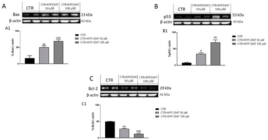 Apoptosis plays a key role in the development of cancer including GB [31]. Deregulation of apoptotic process is a relevant hallmark of a tumor [31], responsible not only for its progression but also for tumor resistance to therapies [32]. Therefore, we investigated the effect of KYP-2047 on the apoptosis pathway in U-87, A-172 and U-138 cell lysates evaluating the pro-apoptotic Bax, tumor suppressor p53 and anti-apoptotic Bcl2 protein by Western blot analysis (The original Western blot can be found in Figure S5). Our results revealed an increase of Bax and p53 levels following KYP-2047 treatment in U87 cell lysates performed for 24 h at the concentrations of 50 μM and 100 μM compared to control group (Figure 8A, see densitometric analysis 8A1; Figure 8B, see densitometric analysis 8B1, respectively); while Bcl2 expression was significantly reduced following KYP-2047 treatment compared to control group (Figure 8C; see densitometric analysis 8C1) in a concentration-dependent manner. The same results appear for A-172 and U-138 cell lysates, confirming an increase of pro-apoptotic Bax and p53 expression following KYP-2047 treatment compared to control group (Figure S1A, see densitometric analysis 1A1; Figure S1B, see densitometric analysis 1B1, respectively) (Figure S2A, see densitometric analysis 2A1; Figure S2B, see densitometric analysis 2B1, respectively) and a decrease of anti-apoptotic Bcl2 protein expression (Figure S1C; see densitometric analysis 1C) (Figure S2C; see densitometric analysis 2C1).