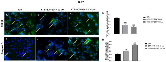 Effect of KYP-2047 on transforming growth factor-β (TGF-β) and caspase-3 expression in U-87 cells. Immunofluorescence assay performed on U-87 cells revealed a marked expression of TGF-β in the control group (A), while the treatment with KYP-2047 at the concentrations of 50 μM and 100 μM reduced significantly TGF-β expression (B,C). Additionally, immunofluorescence staining showed an increase of caspase-3 levels in the groups treated with KYP-2047 at the concentrations of 50 μM and 100 μM (F,G) compared to control group (E). Data are representative of at least three independent experiments. (D) ### p < 0.001 vs. CTR; (H) ## p < 0.01 vs. CTR; ### p < 0.001 vs. CTR.