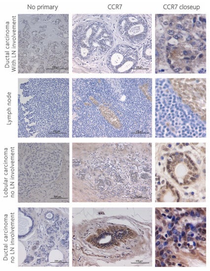 The expression of chemokine receptor CCR7 was assessed in patient samples with invasive ductal and lobular carcinoma with and without lymph node involvement (Figure 1 and Figure S1) using immunohistochemistry. The expression of the receptor was high, with variable staining patterns between cancer types. CCR7 staining in ductal carcinoma was mainly present in the cytoplasm and cell surface, particularly around the ducts, whilst in lobular carcinoma staining was mostly cytoplasmic but was also present in the nucleus of most infiltrating cells. In samples from patients with lymph node involvement, few CCR7 positive cells with cytoplasmic staining were observed.