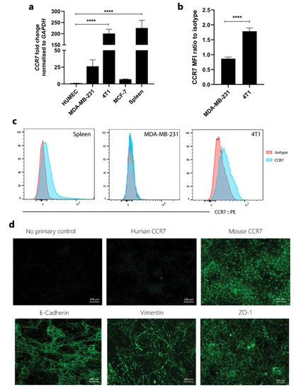 The expression of CCR7 is shown to be upregulated in breast cancer tissue and to mediate metastasis to lymph nodes, but expression in breast cancer lines is poorly defined. Thus, CCR7 expression was assessed in a range of cell lines both at protein and mRNA level. Of the various cell lines tested, only 4T1 expressed moderate CCR7 in both flow cytometry and qPCR assays (Figure 2a–c).
