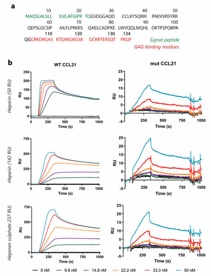 To assess the impact of deletion on chemokine GAG binding, WT-CCL21 and mut-CCL2 binding was analysed by Surface Plasmon Resonance (SPR), in which reducing end biotinylated heparan sulphate (or heparin) was captured on top of a streptavidin sensor chip. This system mimics cell membrane-anchored proteoglycans, and SPR spectroscopy is used to measure changes in the refractive index caused by the interaction that occurs when WT or mut-CCL21 flows at a range of concentrations across the immobilised GAG sensor chips.
