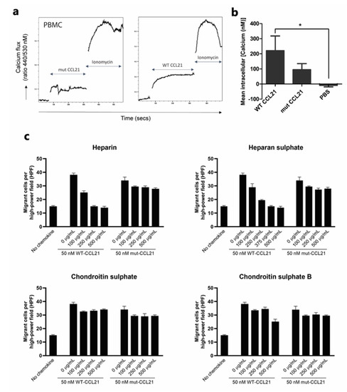 Heparinoids: To assess the functional competence of the impaired GAG binding, chemotactic migration was assessed in CCR7-expressing PBMCs. As seen in Figure 4c, 50 nM of WT or mut-CCL21 was incubated with increasing concentration of several GAGs (heparin, heparan sulphate, chondroitin sulphate A and chondroitin sulphate B) before assessing the migration of PBMCs in trans-filter assays. Heparin and heparan sulphate-bound WT-CCL21 in a dose-dependent manner achieved maximal inhibition at 250 and 500 µg/mL, respectively. However, a minimal effect was seen when competing with mut-CCL21, suggesting that the GAG-binding domain is key to abrogate chemotaxis using heparinoids. Furthermore, no effect was observed when competing with either chondroitin sulphate A or chondroitin sulphate B.