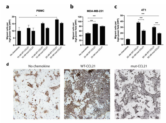 Interestingly, both mut and WT-CCL21 induced PMBC migration at 10, 15 and 20 nM at similar levels (Figure 5a), and no difference was seen in MDA-MB-231 at 20 nM (Figure 5b). However, 4T1 cells’ migration was significantly reduced towards mut-CCL21 compared to the WT at both 30 nM and 50 nM (Figure 5c). As an example, the number of migrated cells observed with no chemokine, 30 nM mut-CCL21 and WT-CCL21 can be seen in Figure 5d.