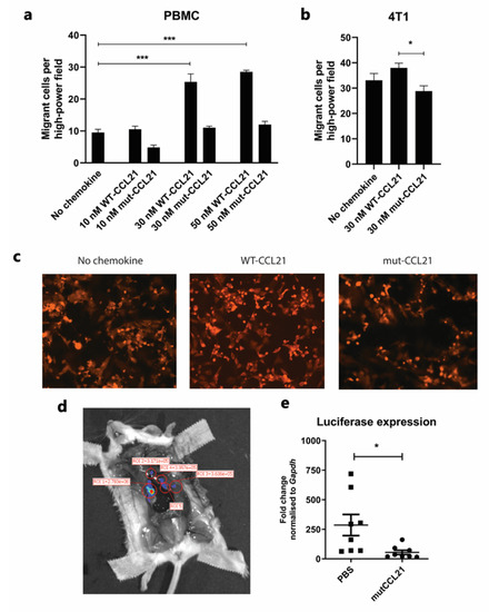 In contrast to the results for trans-filter migration for PBMCs, it was found that mut-CCL21 stimulated significantly reduced trans-endothelial cell migration of both 4T1 cells and PBMCs when used at 30 nM (Figure 6a–c), with levels remaining similar to the unstimulated cells. Similar results were also observed with MDA-MB-231 cells (Figure S3b)