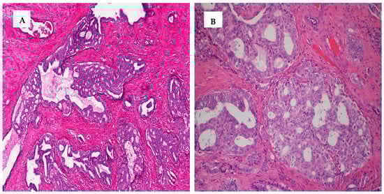 Intraductal carcinoma of the prostate (IDC-P) (10×) (A) and invasive cribriform PCa (B) (20×).
